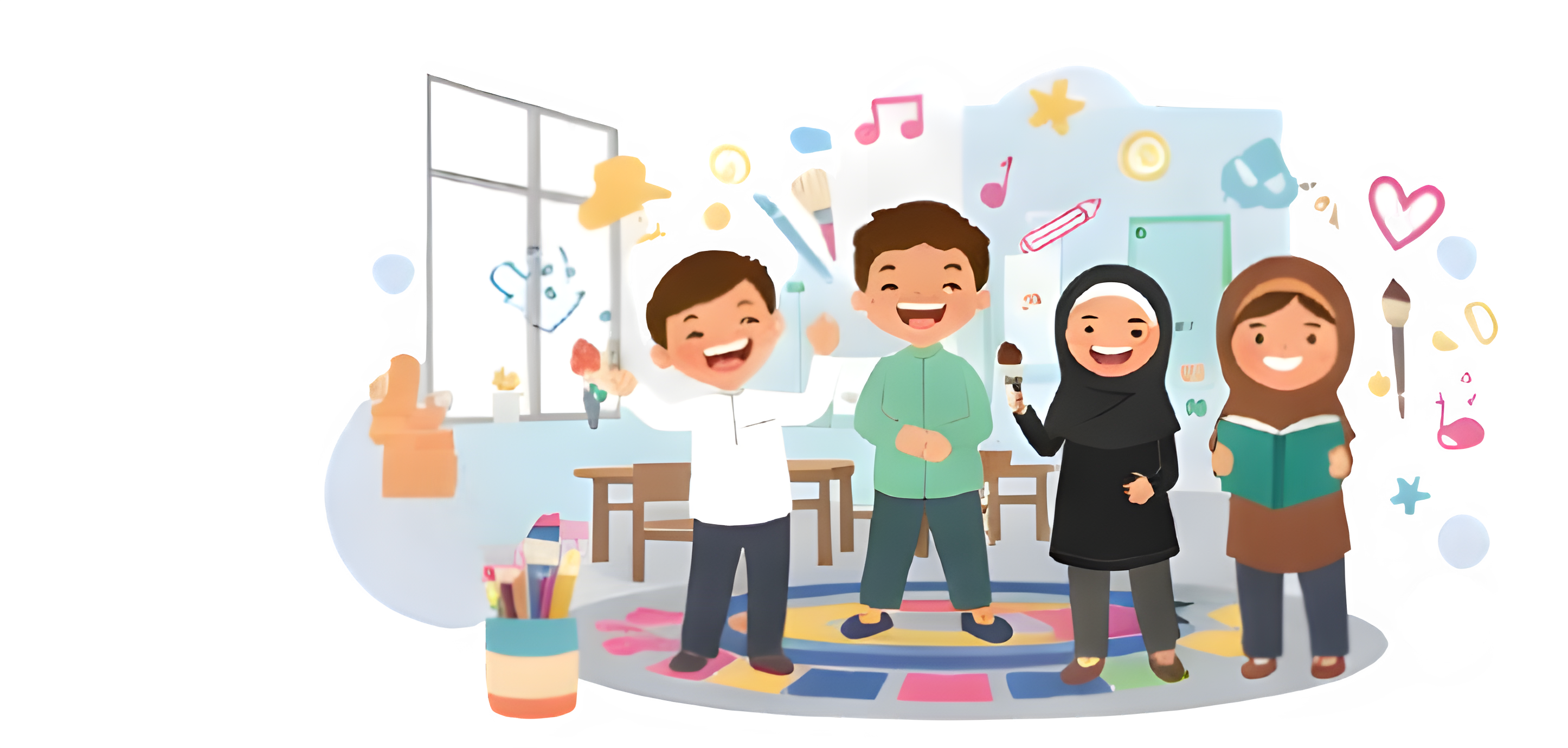 Pembelajaran Al-Quran, doa-doa harian, dan nilai-nilai Islam yang ditanamkan melalui cerita dan aktivitas interaktif.